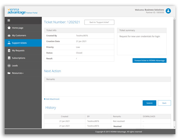 Registre notificaciones internas, cree y guarde archivos o adjunte documentos y envíe correos electrónicos al cliente. Cuando se realiza el ticket, se puede enviar un correo electrónico automático al cliente.