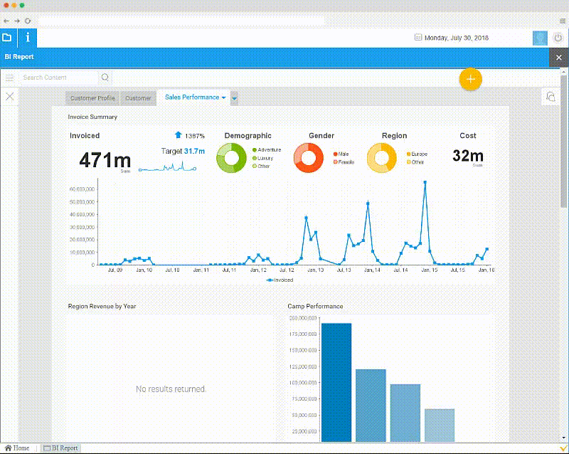 VA viene con un Sistema de Inteligencia de Negocios incorporado que ha aparecido en el Cuadrante Mágico de Gartner y ha sido nombrado visionario. Forrester lo ha reconocido como "Fuerte desempeño".